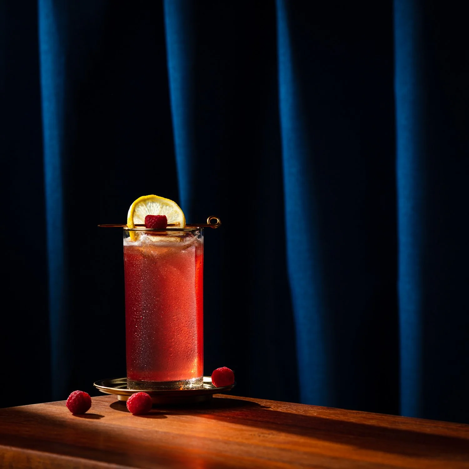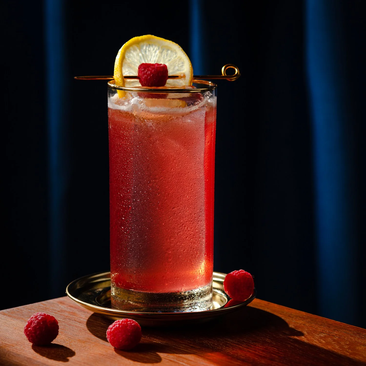 Double strain over new ice in a highball glass, fill up with ginger beer, and garnish with a lemon wheel and raspberry on a cocktail pick.