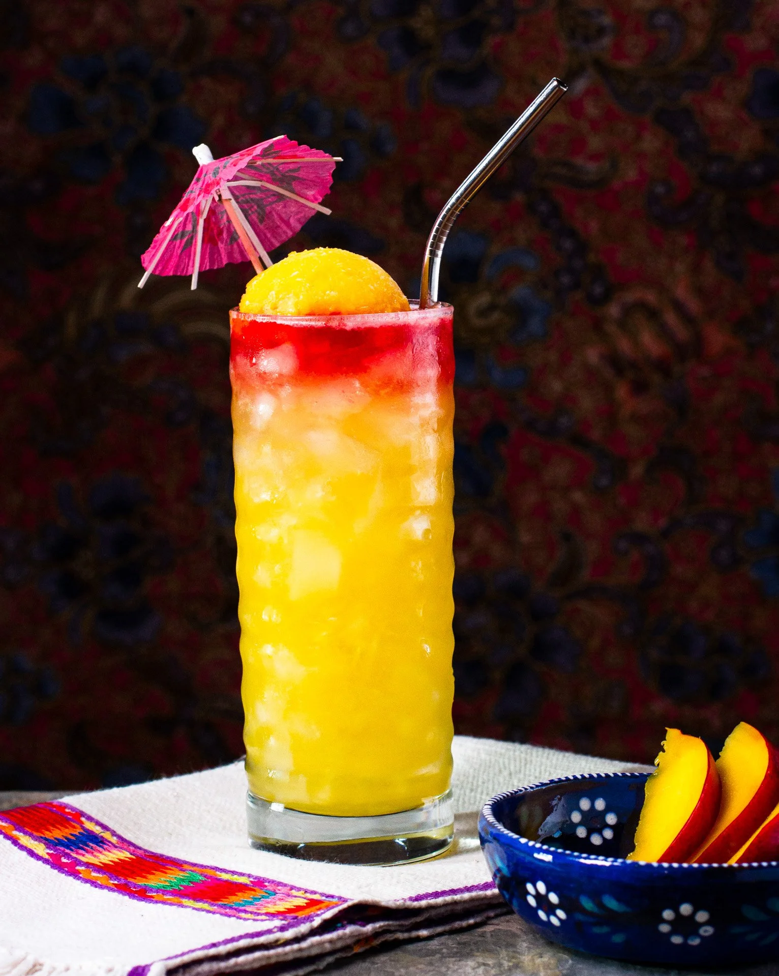 • Fill with crushed ice and top with hibiscus rose infused Wray & Nephew and a scoop of mango sorbet.