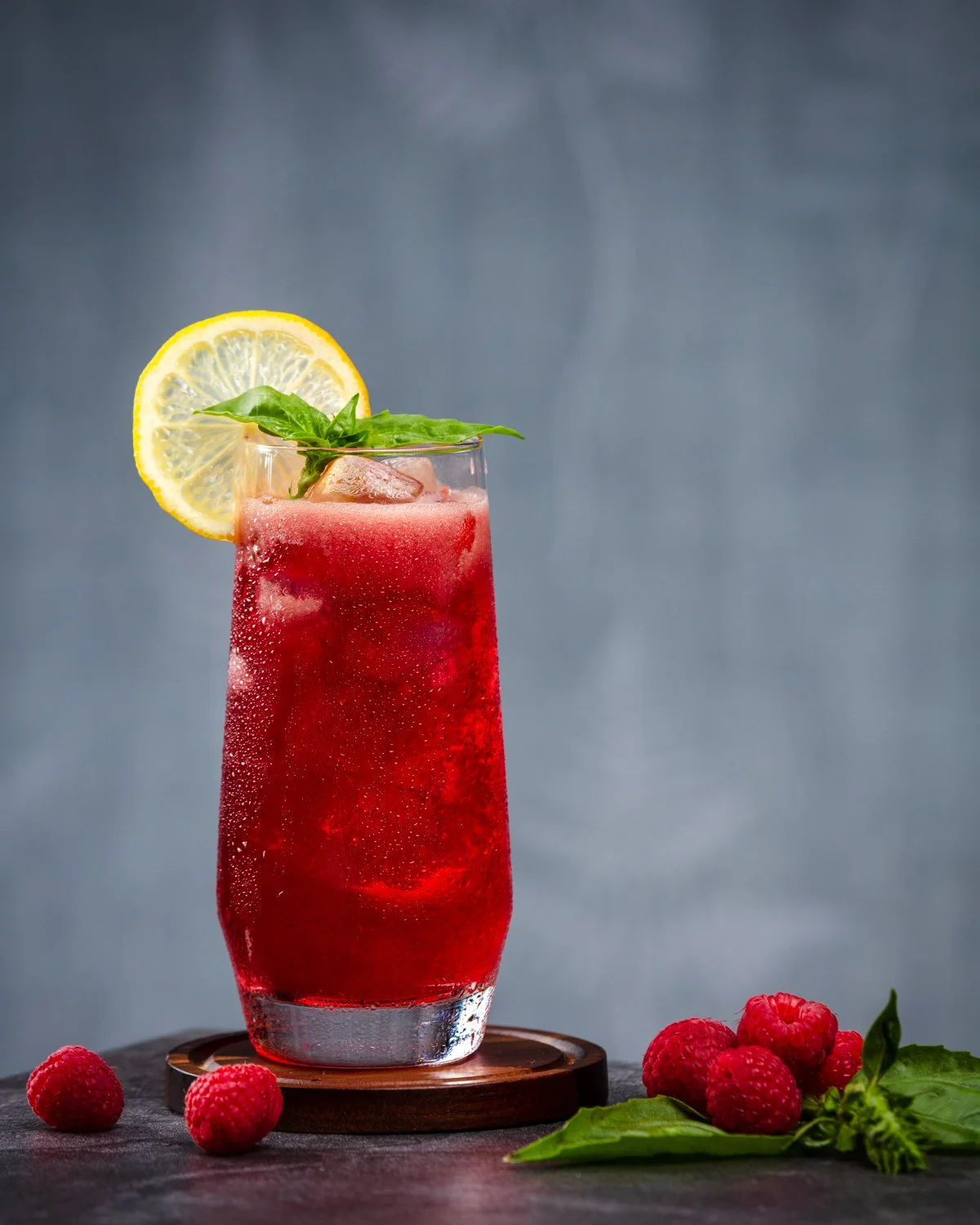 Double strain over new ice in a highball glass and garnish with raspberries and a basil leaf